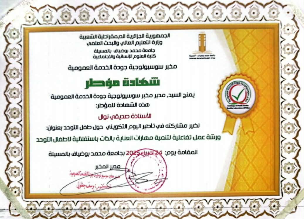 Nawal SEDDIKI , ,(2025-04-24), مهارات التواصل عند اطفال التوحد,ورشة عمل تفاعلية لتنمية مهارات العناية بالذات بالاستقلالية للاطفال التوحد,جامعة محمد بوضياف المسيلة