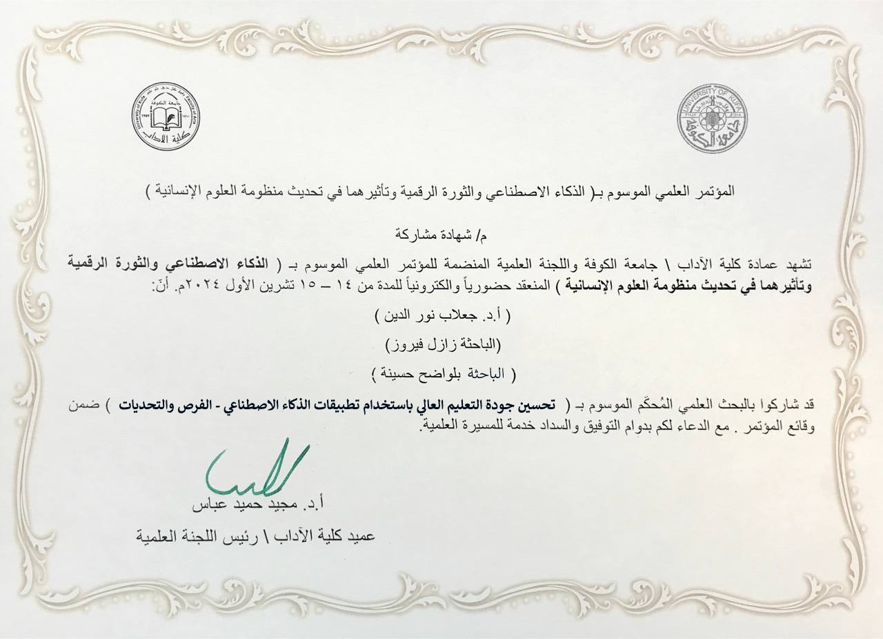Fairouz ZAZEL , NOURDINE Djaalab , Hassina BELOUADAH , ,(2024-10-23), تحسين جودة التعليم العالي باستخدام تطبيقات الذكاء الاصطناعي -الفرص والتحديات-,الذكاء الاصطناعي والثورة الرقمية وتأثيرهما في تحديث منظومة العلوم الإنسانية,جامعة الكوفة كلية الآداب العراق