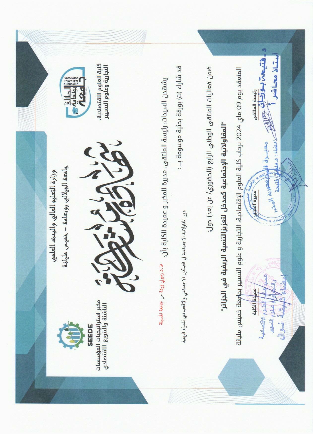 Ouarda ZEMIRLI , ,(2024-05-09), دور المقاولاتية الاجتماعية في التمكين الاجتماعي والاقتصادي للمرأة الريفية,المقاولاتية الاجتماعية كمدخل لتعزيز التنمية الريفية في الجزائر,جامعة الجيلالي بونعامة خميس مليانة