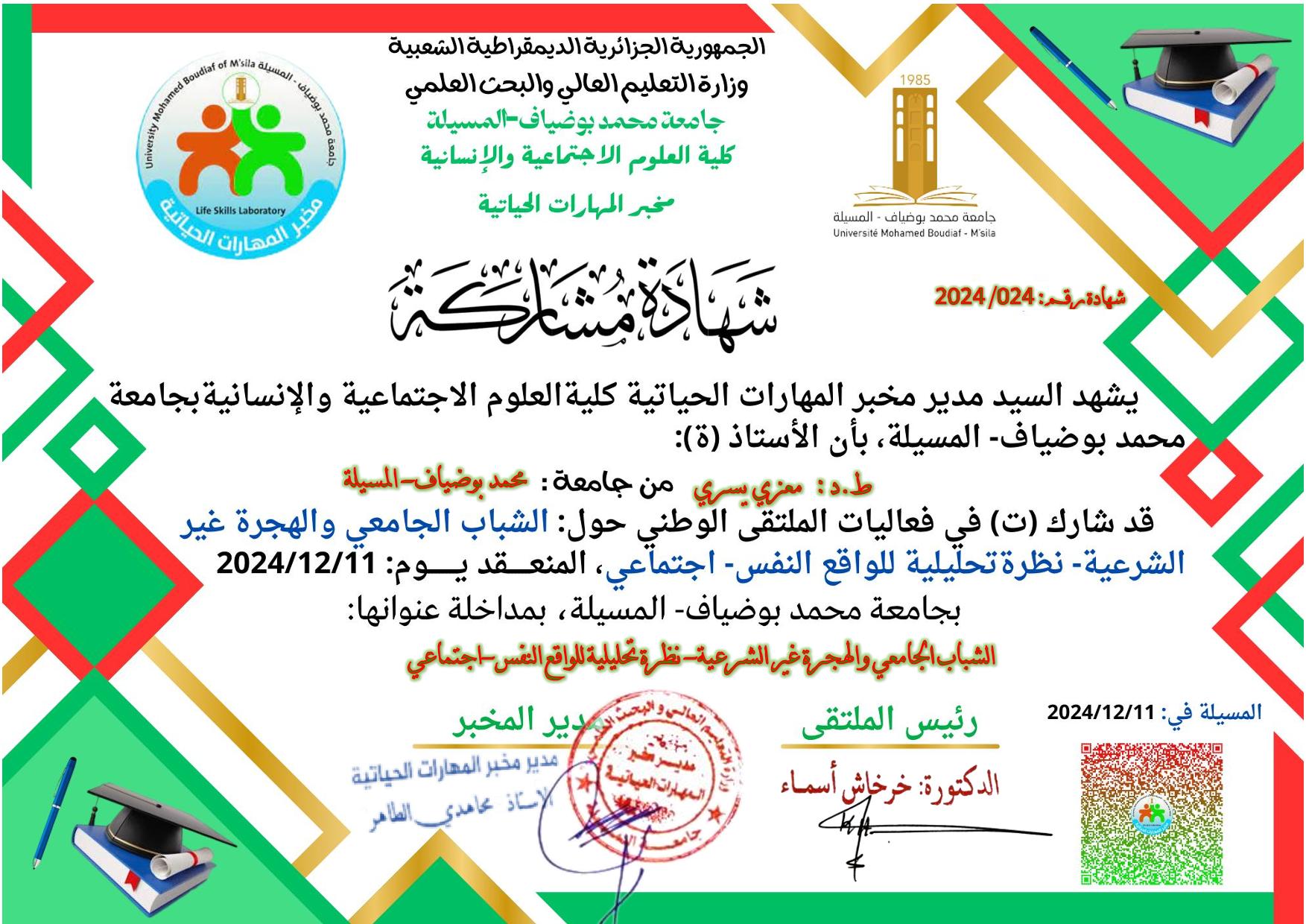 mazi yousra , ,(2024-12-11), الشباب الجامعي و الهجرة غير الشرعية-نظرة تحليلية للواقع النفسي-الاجتماعي,الشباب الجامعي والهجرة الغير الشرعية-نظرة تحليلية للواقع النفس-اجتماعي,جامعة محمد بوضياف -المسيلة
