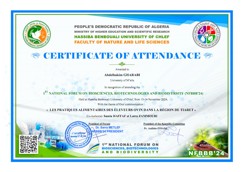 Abdelhakim GHARABI , ,(2024-11-13), LES PRATIQUES ALIMENTAIRES DES ÉLEVEURS OVIN DANS LA RÉGION DE TIARET,1st National Forum on Biosciences, Biotechnology, and Biodiversity NFBBB-Chlef,Chlef