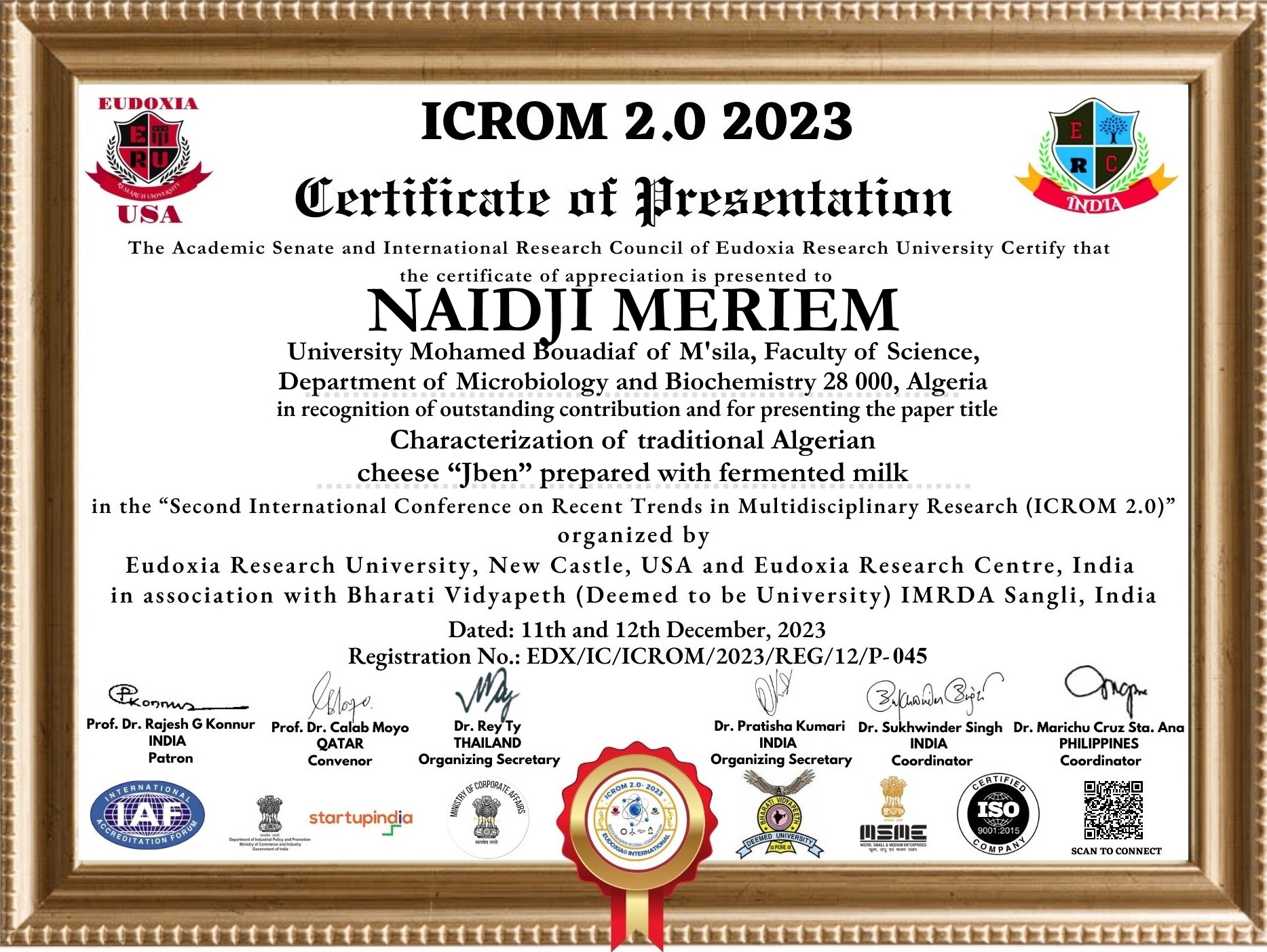 Meriem NAIDJI , ,(2023-12-11), Characterization of traditional Algerian cheese "Jben" prepared with fermented milk,the Second International Conference on Recent Trends in Multidisciplinary Research "ICROM 2.0" 2023,india