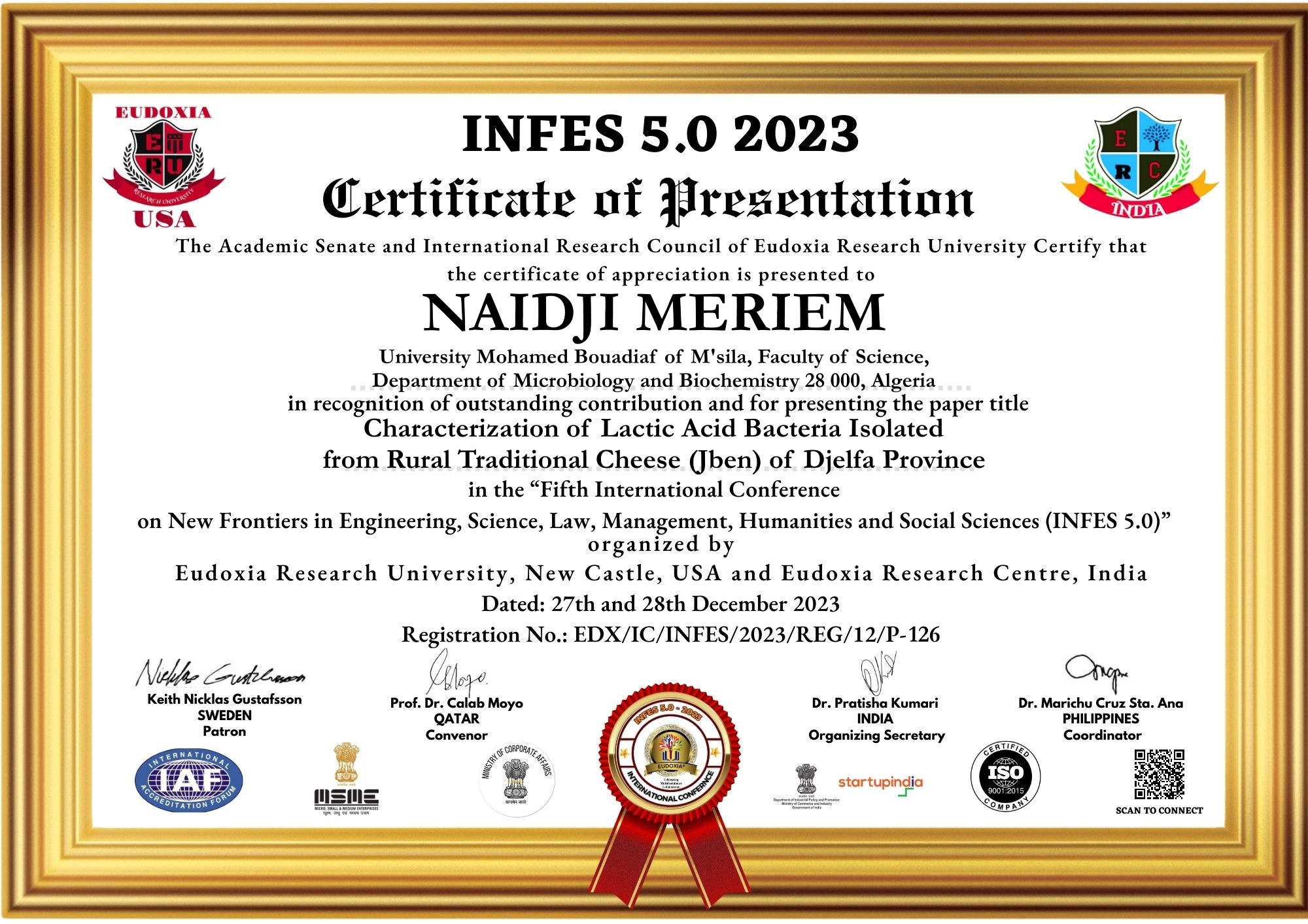 Meriem NAIDJI , ,(2023-12-27), Characterization of Lactic Acid Bacteria Isolated from Rural Traditional Cheese (Jben) of Djelfa Province,the Fifth International Conference on New Frontiers in Engineering, Science, Law, Management, Humanities and Social Sciences "INFES 5.0",india