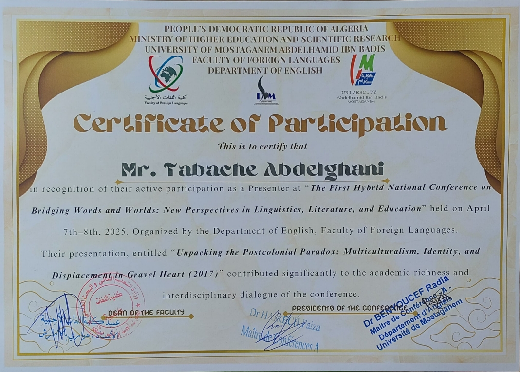 TABACHE Abdelghani , ,(2025-12-15), Amidst Suffering and Belonging: Arabic as a Linguistic Choice in Feminist Discourse in Ahlem Mostaghanemi’s the Dust of Promises,Languages, Cultures and Patrimony: Critical Intersection of Preservation and Transmission,Abou Bekr Belkaid University - Tlemcen