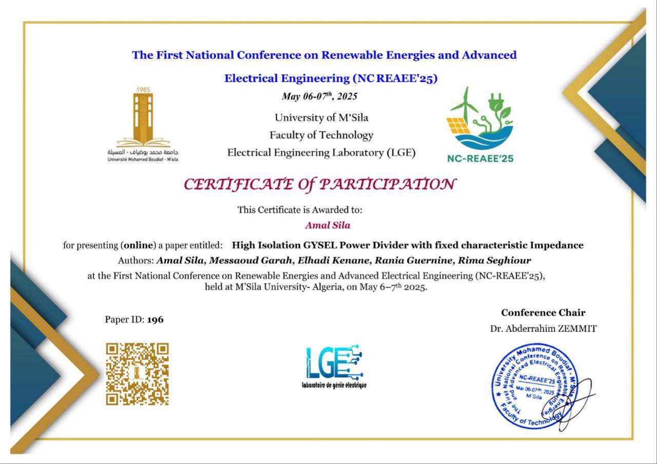 ELhadi KENANE , Amal SILA , Messaoud GARAH , Rania GUERNINE , Rima SEGHIOUR , ,(2025-05-07), High Isolation GYSEL Power Divider with fixed characteristic Impedance,1st National Conference on Renewable Energies and Advanced Electrical Engineering (NC-REAEE'25),University of Msila