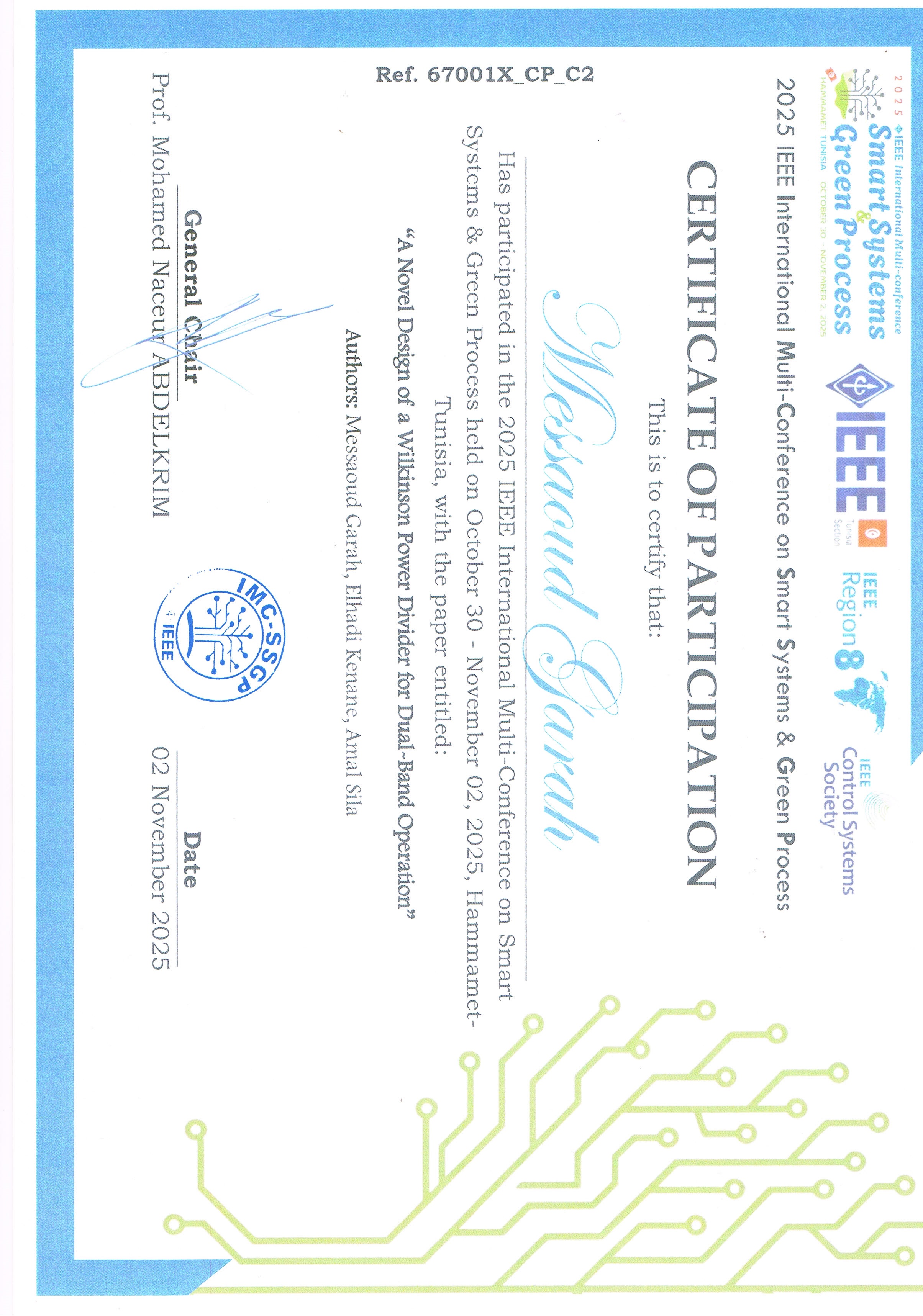 Messaoud GARAH , Amal SILA , elhadi.kinane@univ-msila.dz, ,(2025-10-30), A Novel Design of a Wilkinson Power Divider for Dual-Band Operation,2025 IEEE International Multi-Conference on Smart Systems & Green Process,HAMMAMET, Tunisia