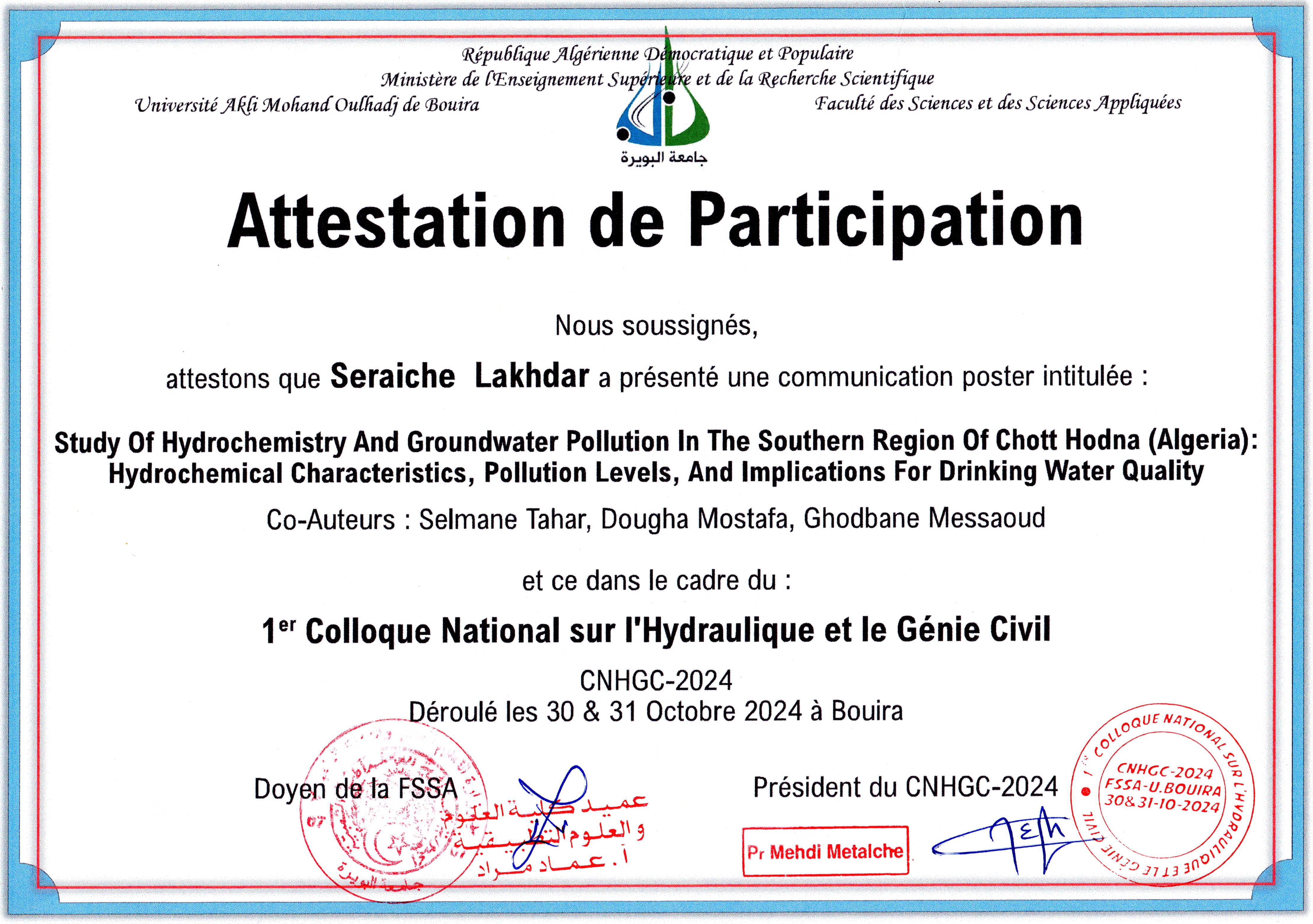 Mostafa Dougha , ,(2024-10-30), Study Of Hydrochemistry And Groundwater Pollution In The Southern Region Of Chott Hodna (Algeria): Hydrochemical Characteristics, Pollution Levels, And Implications For Drinking Water Quality,1ER COLLOQUE NATIONAL SUR L’HYDRAULIQUE ET GENIE CIVIL CNHGC-2023At: BOUIRA,BOUIRA