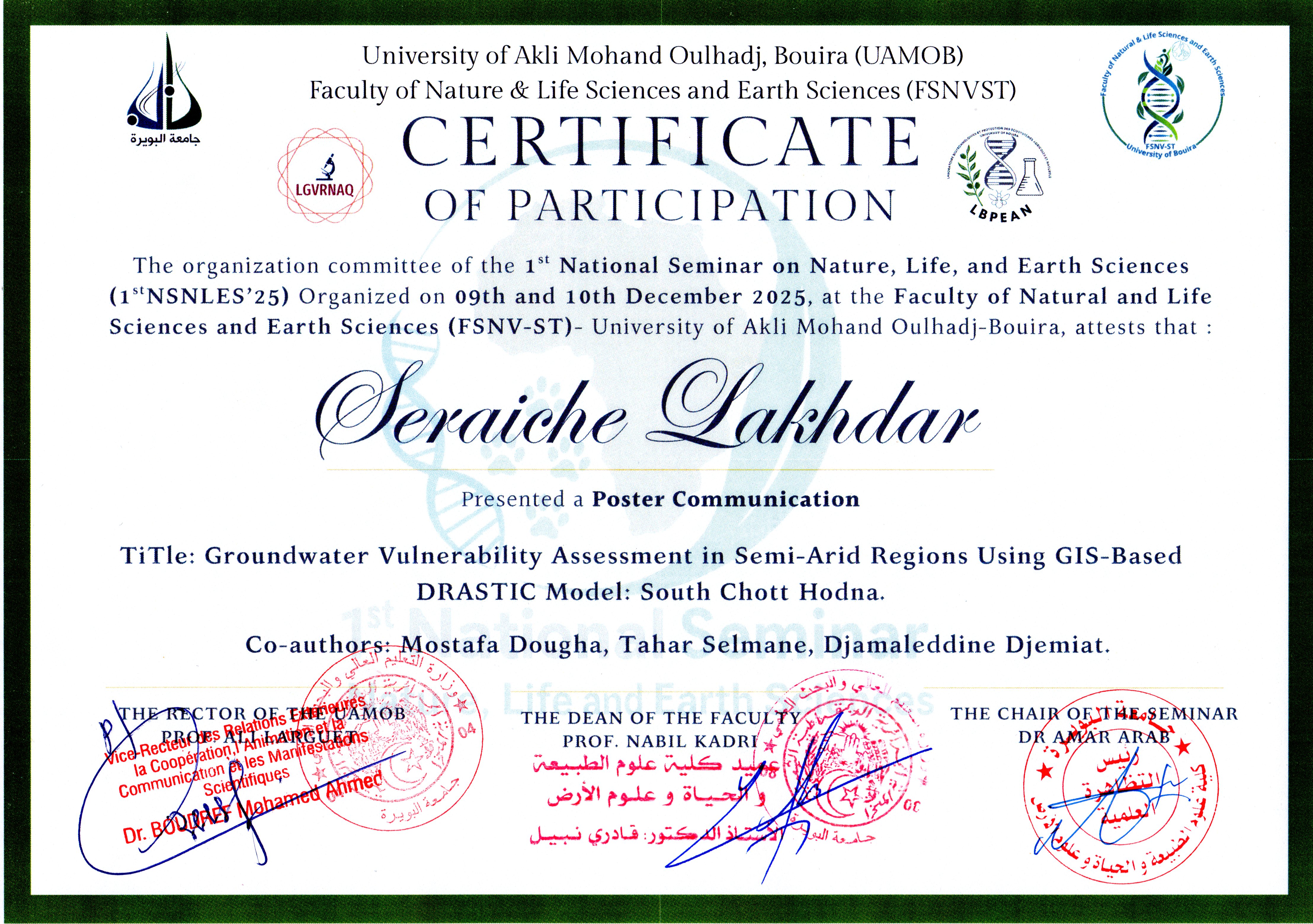 Mostafa Dougha , ,(2025-12-09), Groundwater Vulnerability Assessment in Semi-Arid Regions Using GIS-Based DRASTIC Model: South Chott Hodna,1ST NATIONAL SEMINAR ON Nature,Life,and Eurth Scienes 1stNSNLES’25At: BOUIRA,Bouira