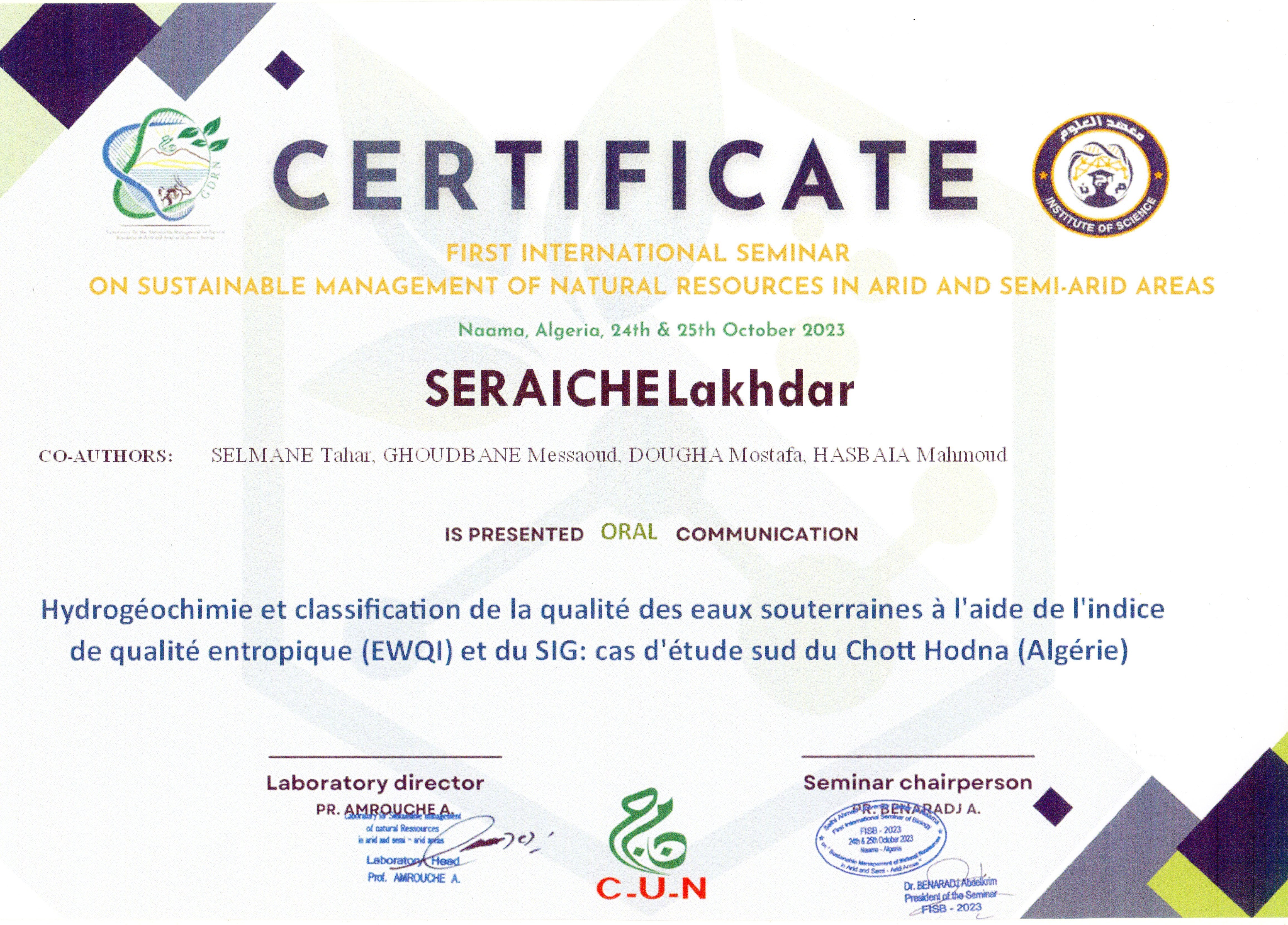Mostafa Dougha , ,(2023-10-24), Hydrogéochimie et classification de la qualité des eaux souterraines à l'aide de l'indice de qualité entropique (EWQI) et du SIG : cas d'étude sud du Chott Hodna (Algérie),1er séminaire international de biologie sur la gestion durable des ressources naturelles en zones arides et semi-arides,Naama, Algeria