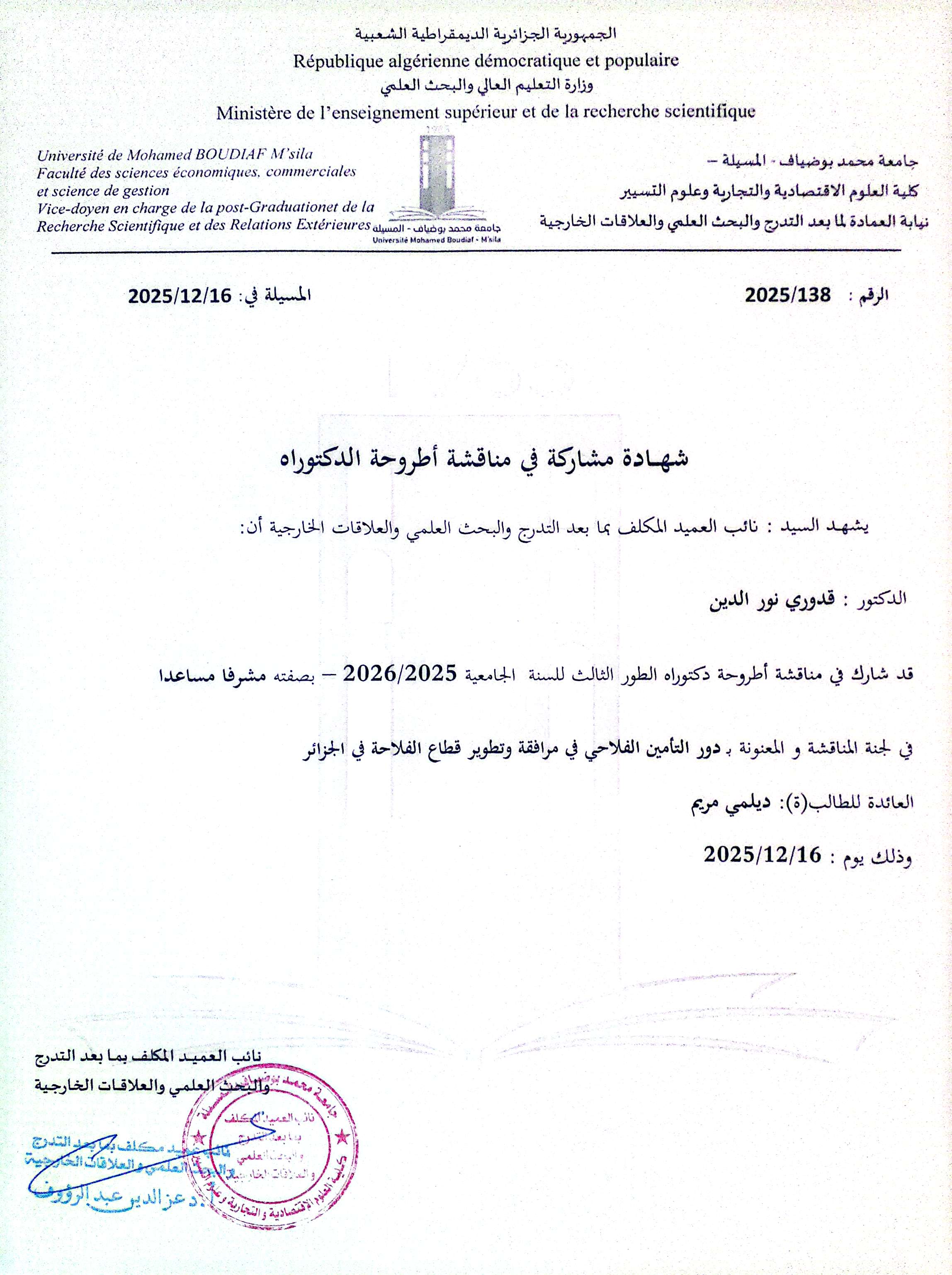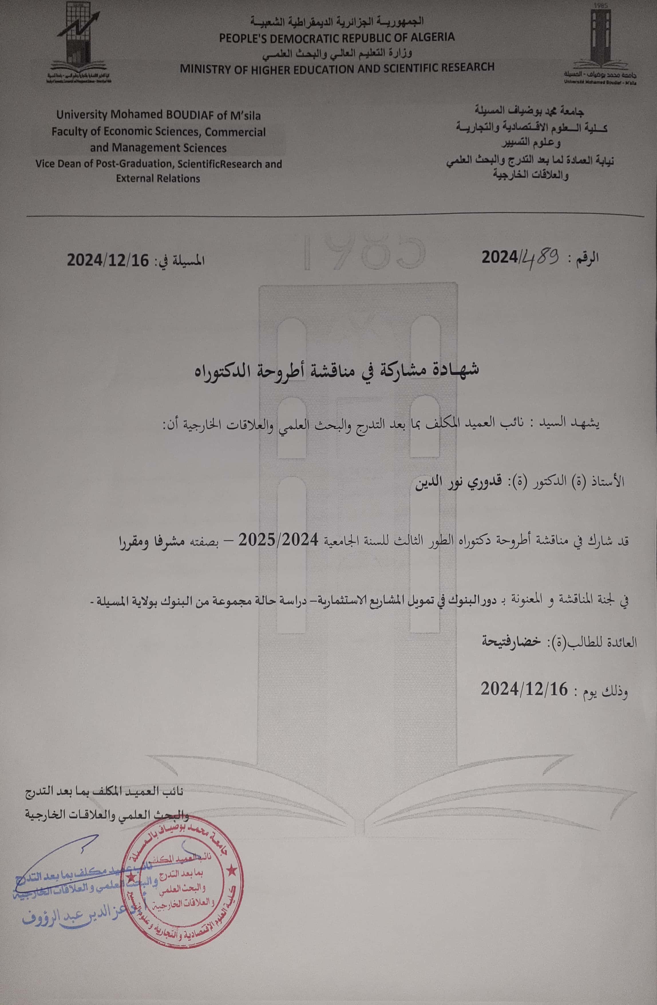 Noureddine KADDOURI , ,(2021), تكوين المورد البشري كالية لتحسين اداء المؤسسسة,تبني نظام ادارة الجودة الشاملة وتاهيل الايزو لزيادة صادرات المؤسسات الاقتصادية الحزائرية,المسيلة