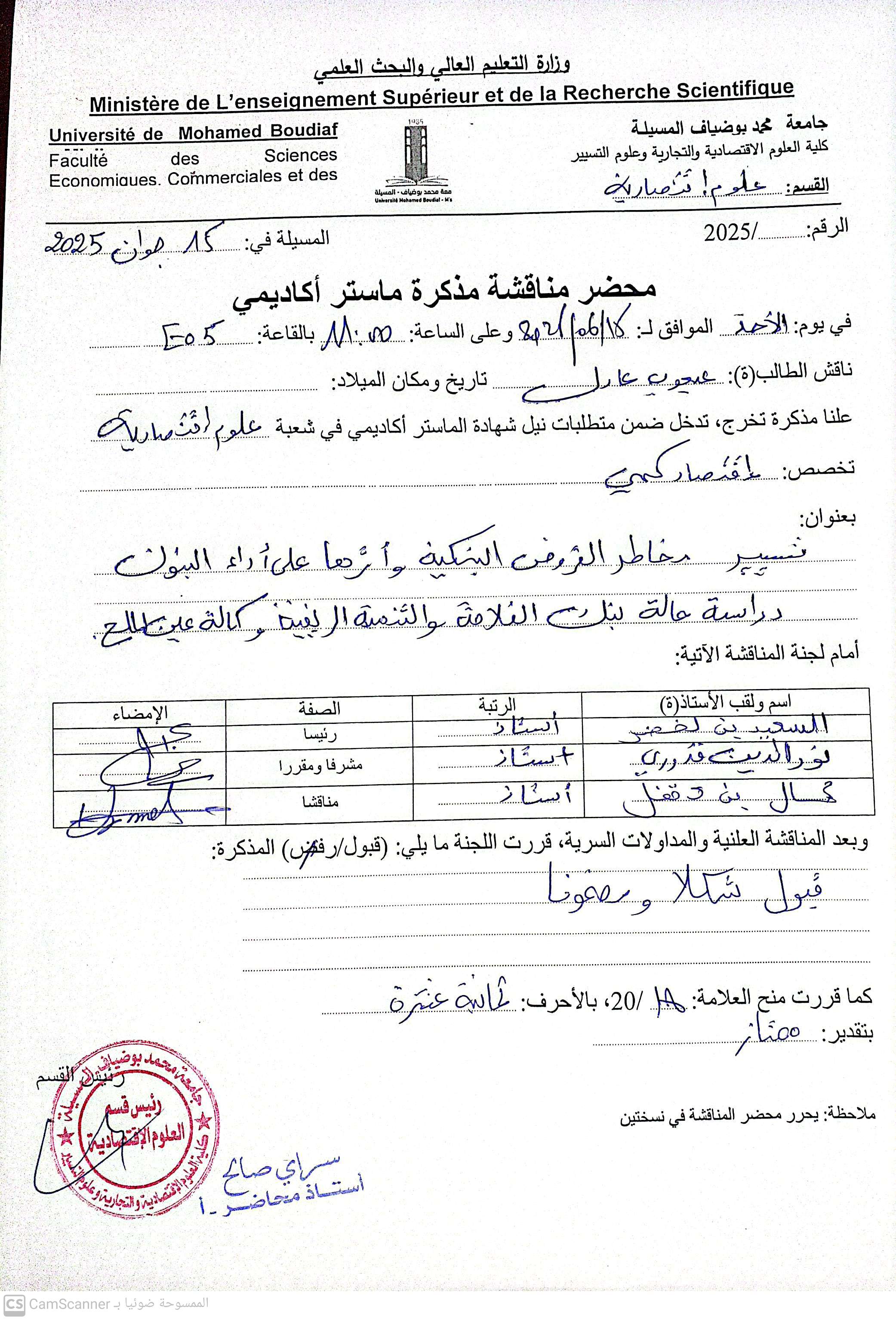 تسيير مخاطر القروض البنكية وأثرها على أداء البنوك دراسة حالة بنك الفلاحة والتنمية الريفية وكالة عين الملح