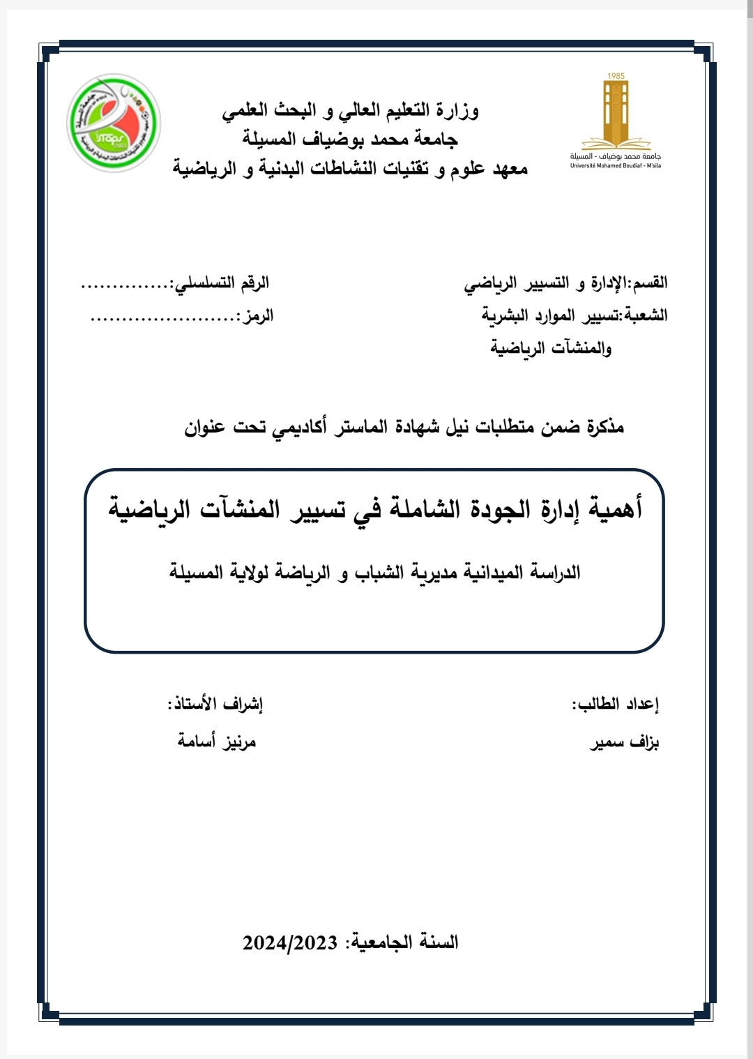 OUSSAMA Merniz , , (2022), الحوكمة الرياضية و ادارة الجودة الشاملة في الهيئات الرياضية, الابداع الرياضي, Vol:13, Issue:2, pages:444-457, جامعة المسيلة