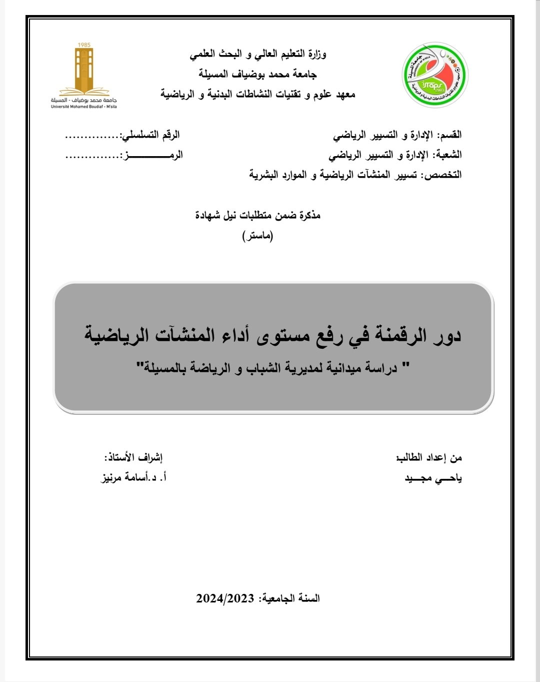 OUSSAMA Merniz , ,(2024-04-23), التكنولوجيا الحديثة و تطبيقات في علوم الرياضة,دور تكنولوجيا الإعلام والاتصال في تنظيم الظاهرة الرياضية,جامعة المسيلة