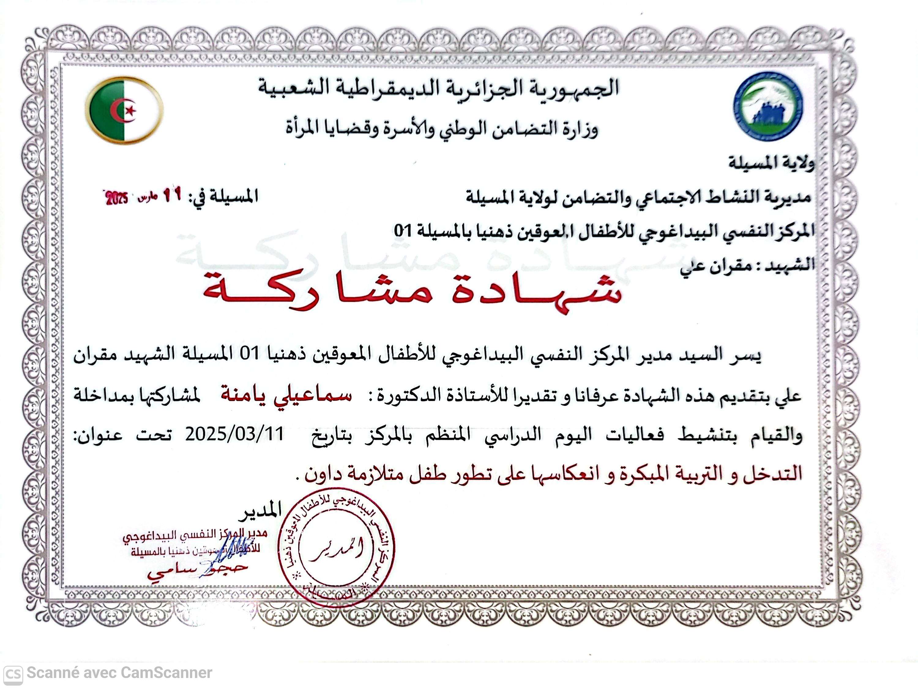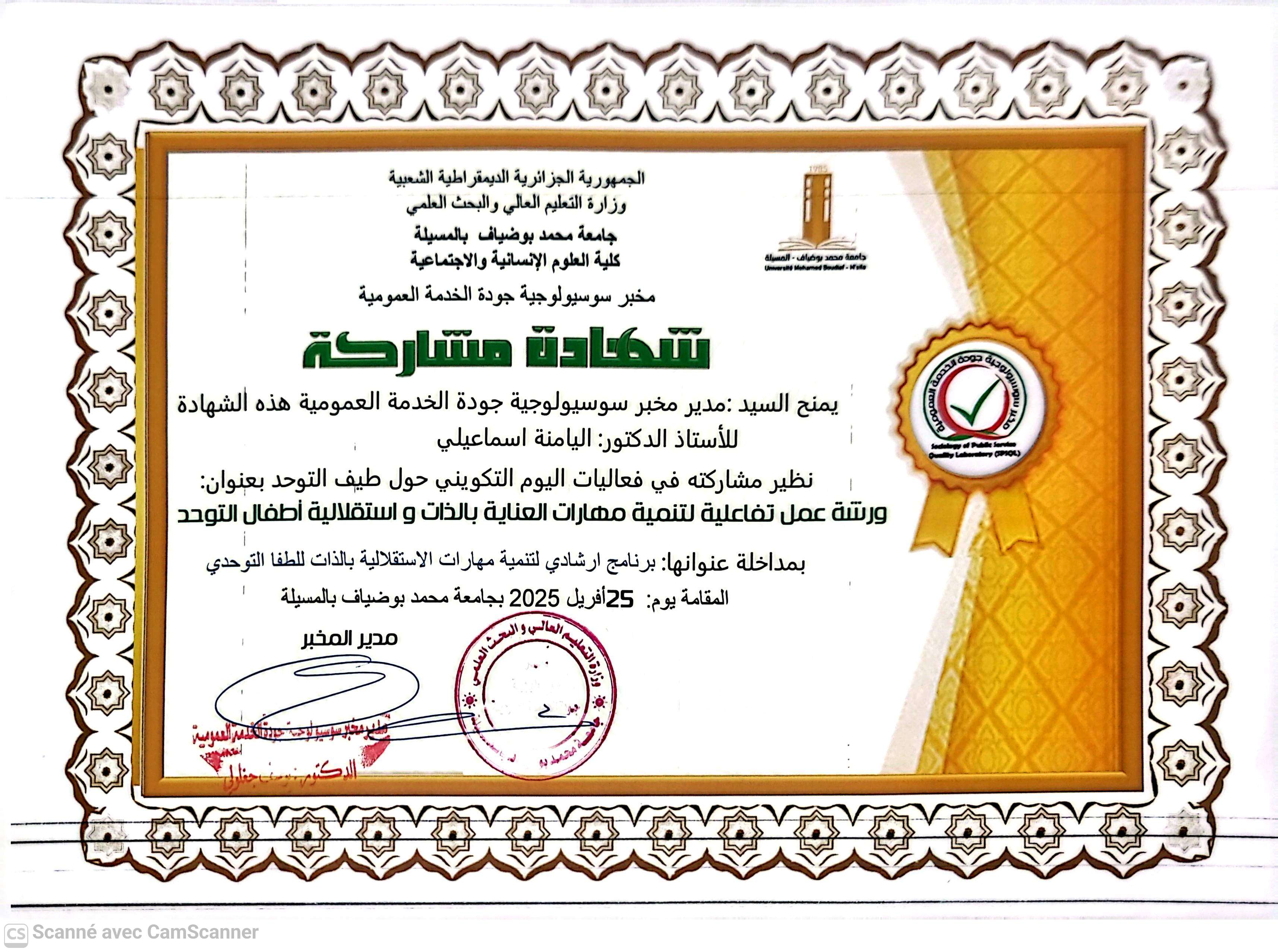 YAMENA Ismaili , ,(2019), journee de sensibilisation sur les troubles de lautisme,journee de sensibilisation sur les troubles de lautisme,letablissement hospitalier specialise au psychiatre ouled mansour msila
