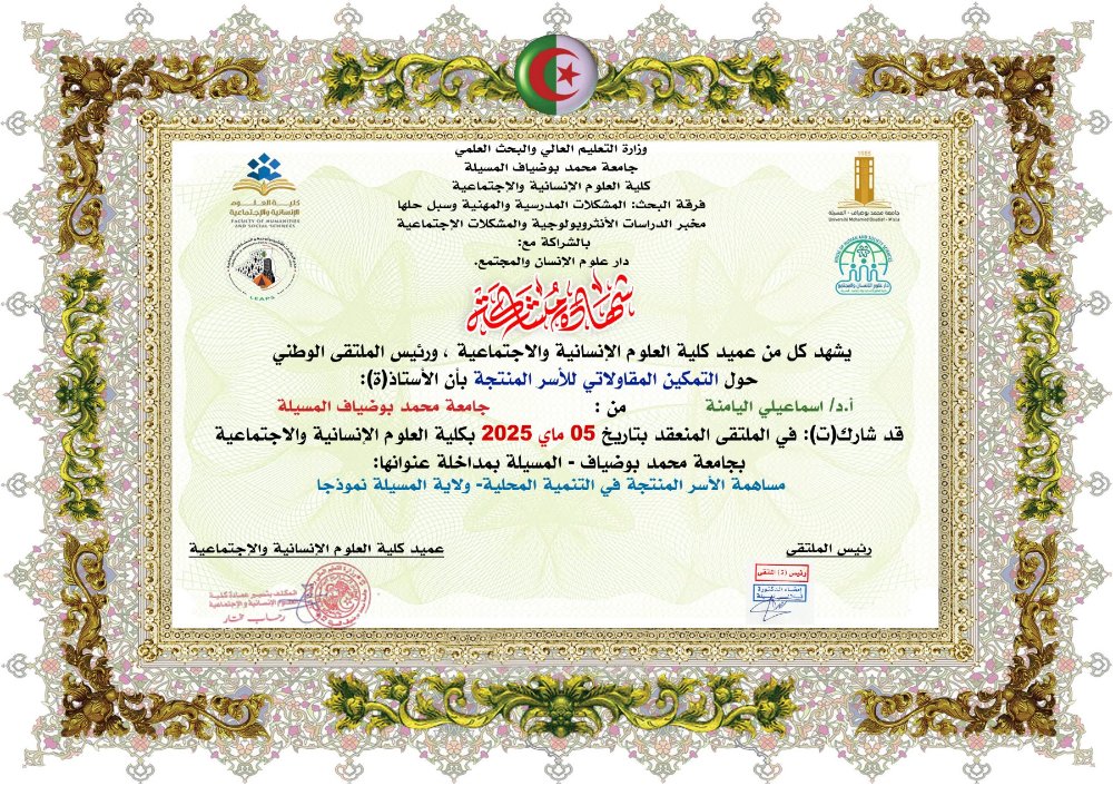 YAMENA Ismaili , ,(2023), الارشاد والتوجيه العائلي الية لتفعيل الشراكة بين الاسرة والمؤسسة,يامنة اسماعيلي,université de msila