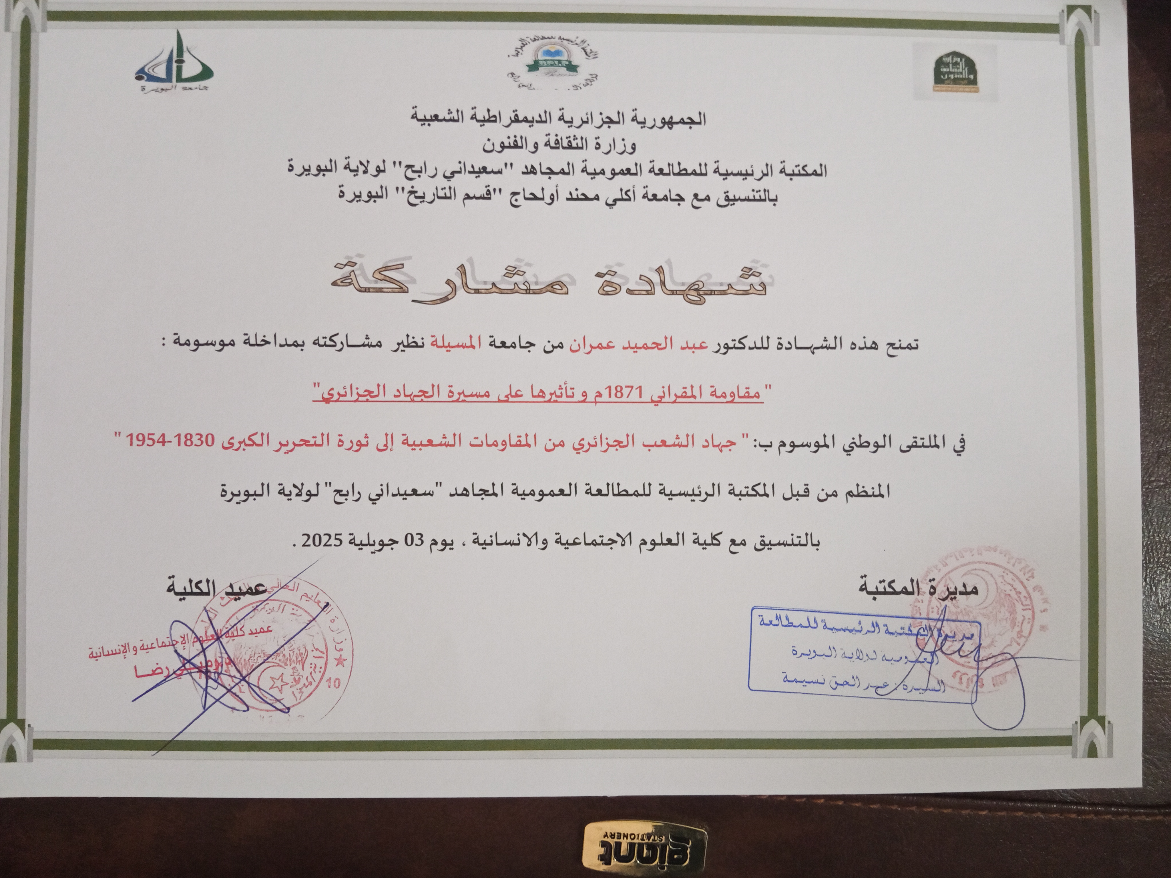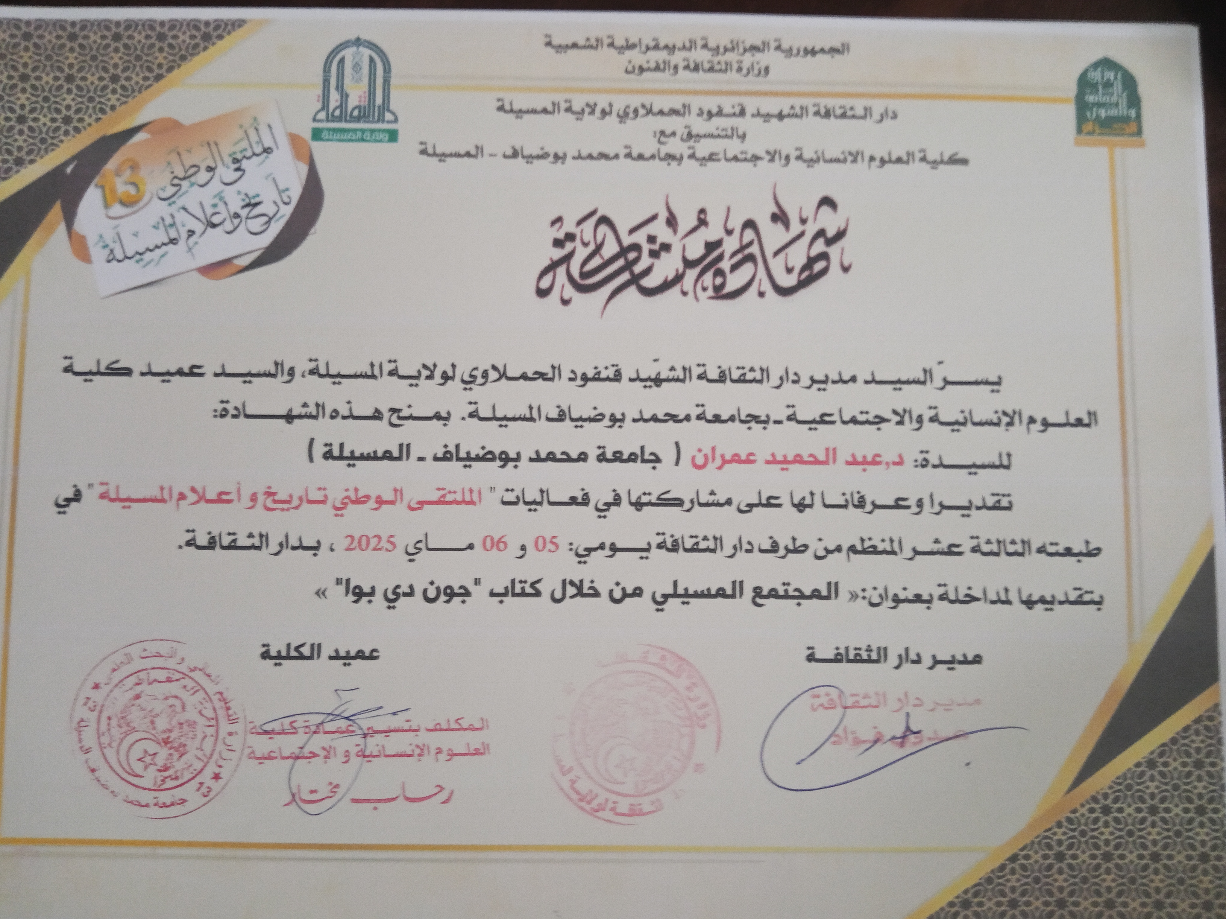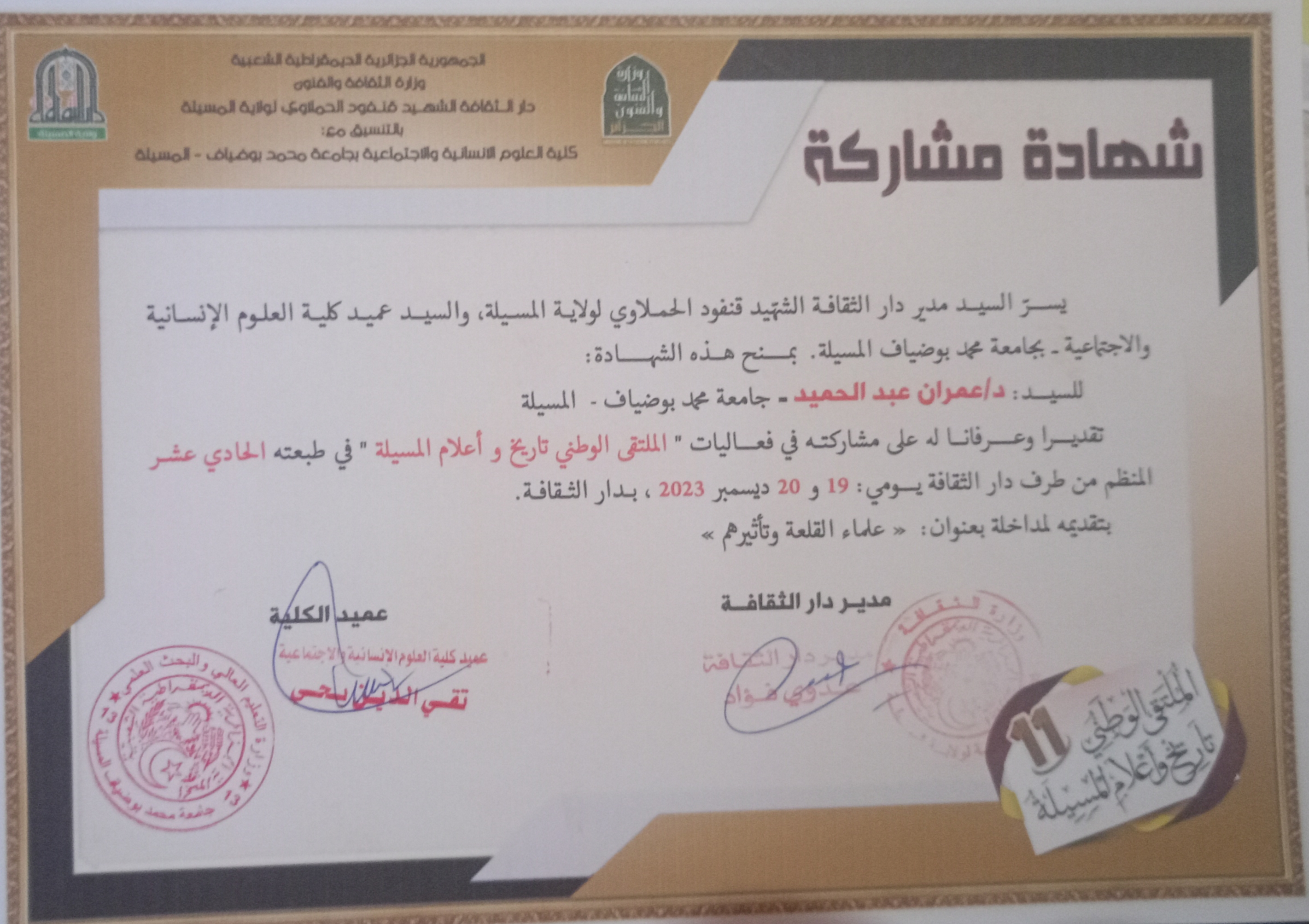 ABDELHAMID Amrane , ,(2023-12-19), علماء القلعة وتأثيرهم,الملتقى الوطني تاريخ وأعلام المسيلة,جامعة المسيلة+ دار الثقافة بالمسيلة