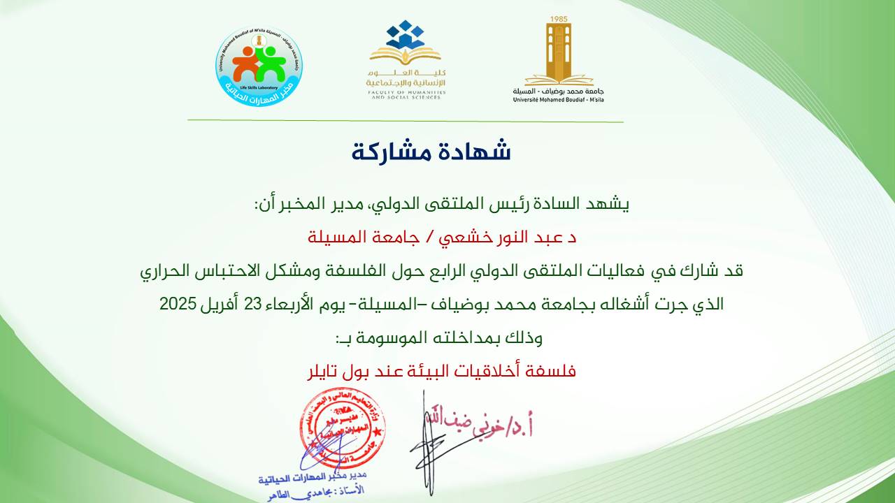 ABDENOUR Khechai , ,(2025-04-23), فلسفة اخلاقيات البيئة عند بول تايلر,الفلسفةو مشكلة الاحتباس الحراري,كلية العلوم الانسانيةوالاجتماعية جامعة المسيلة