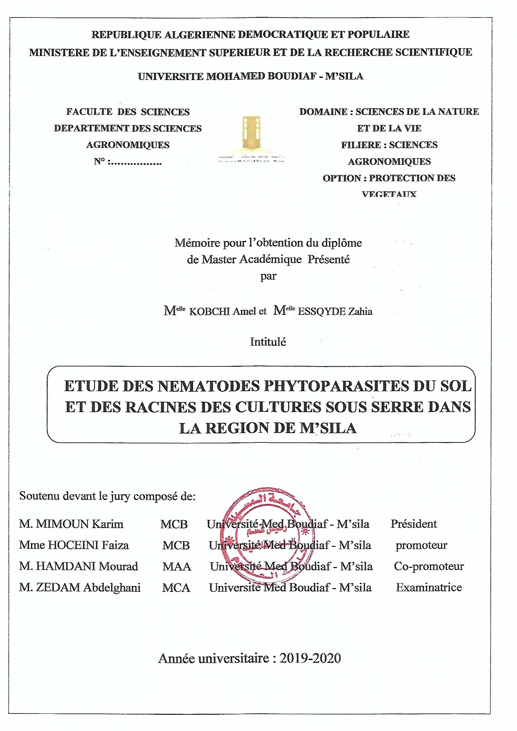 ETUDE DES NEMATODES PHYTOPARASITES DU SOL ET DES RACINES DES CULTURES SOUS SERRE DANS LA REGION DE M’SILA