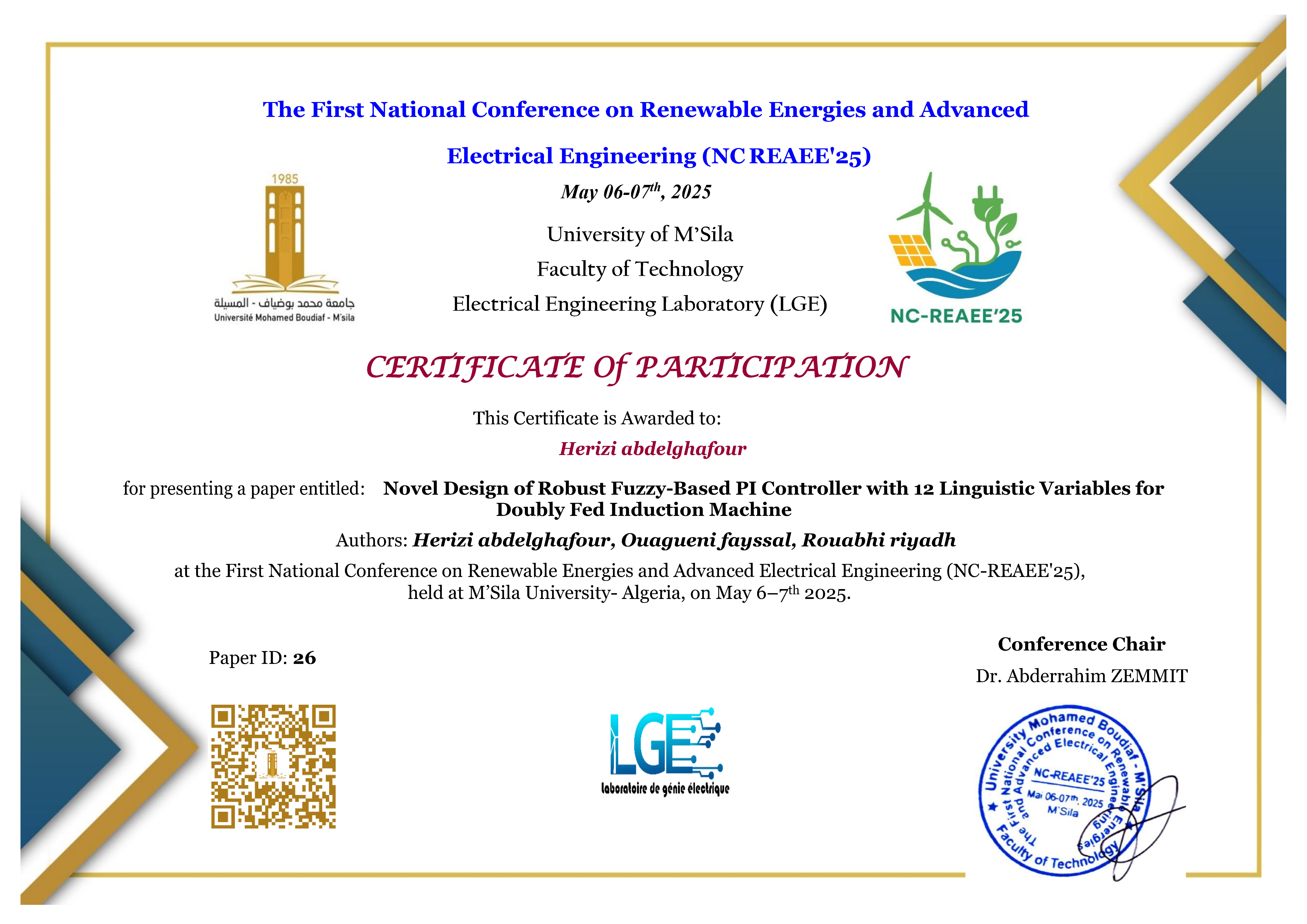 FAYSSAL Ouagueni , ,(2025-05-06), Novel design of robust fuzzy-based PI controller with 12 linguistic variables for doubly fed induction machine,The First National Conference on Renewable Energies and Advanced Electrical Engineering,M’Sila, Algeria