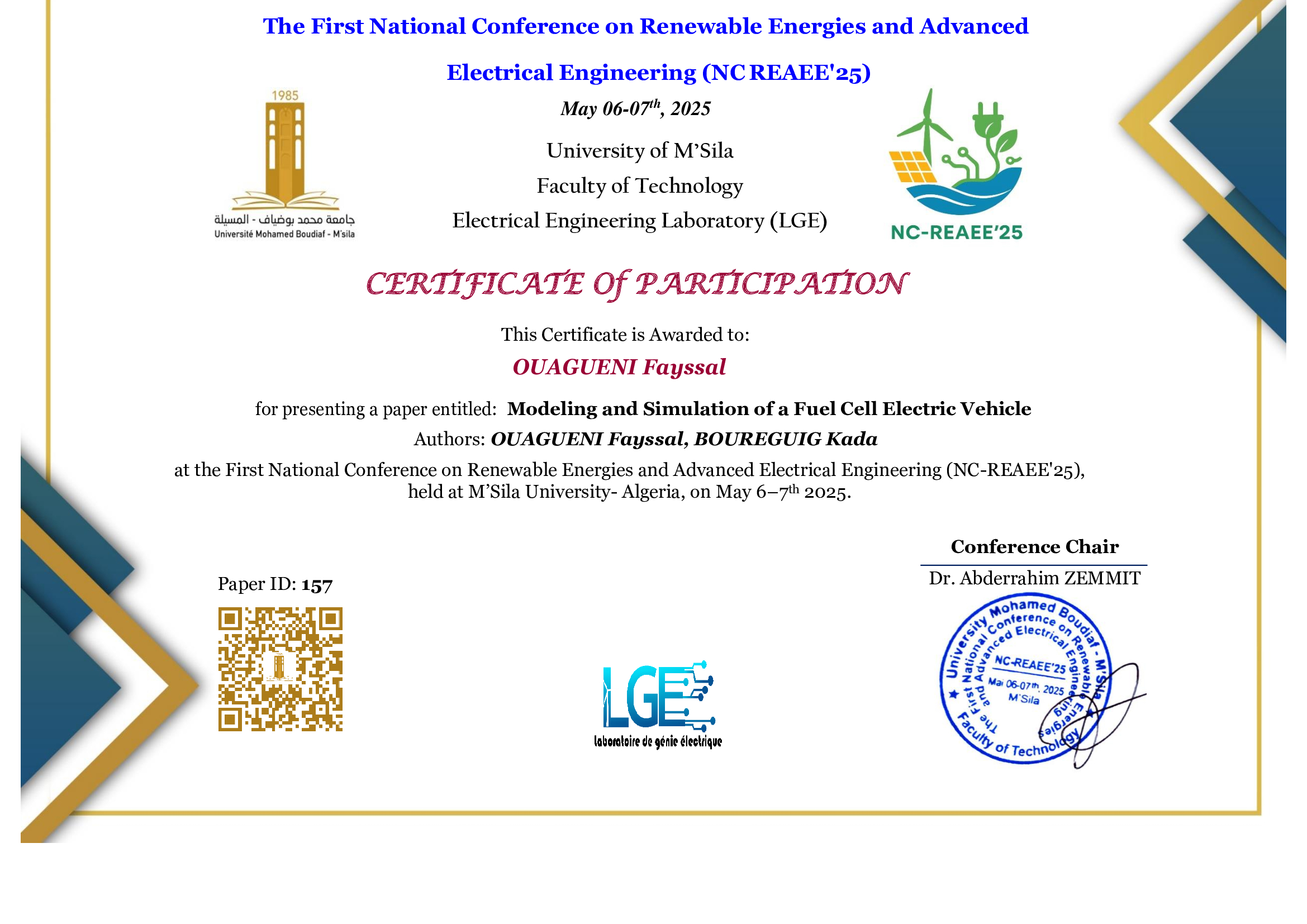 FAYSSAL Ouagueni , ,(2025-05-06), Modeling and simulation of a fuel cell electric vehicle,The First National Conference on Renewable Energies and Advanced Electrical Engineering,M’Sila, Algeria