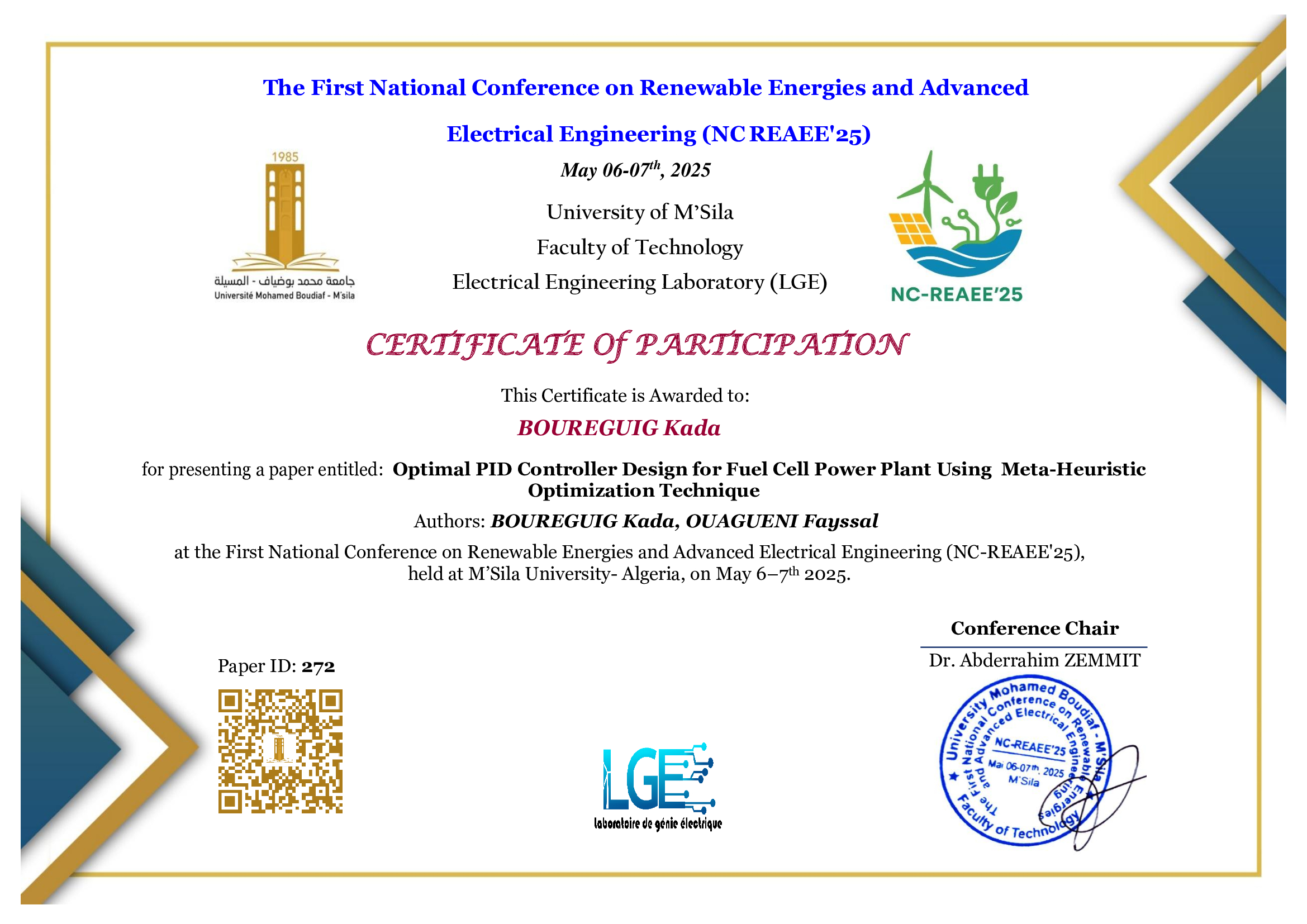 FAYSSAL Ouagueni , ,(2025-05-06), Optimal PID Controller Design for Fuel Cell Power Plant Using Meta-Heuristic Optimization Technique,The First National Conference on Renewable Energies and Advanced Electrical Engineering,M’Sila, Algeria