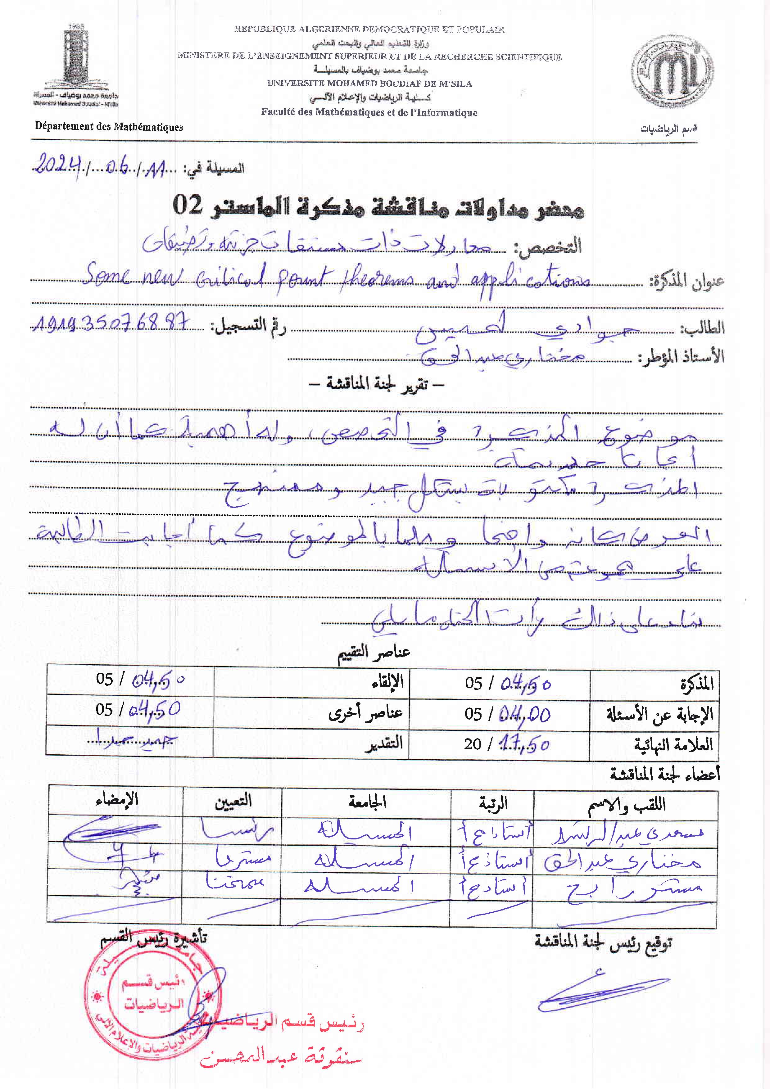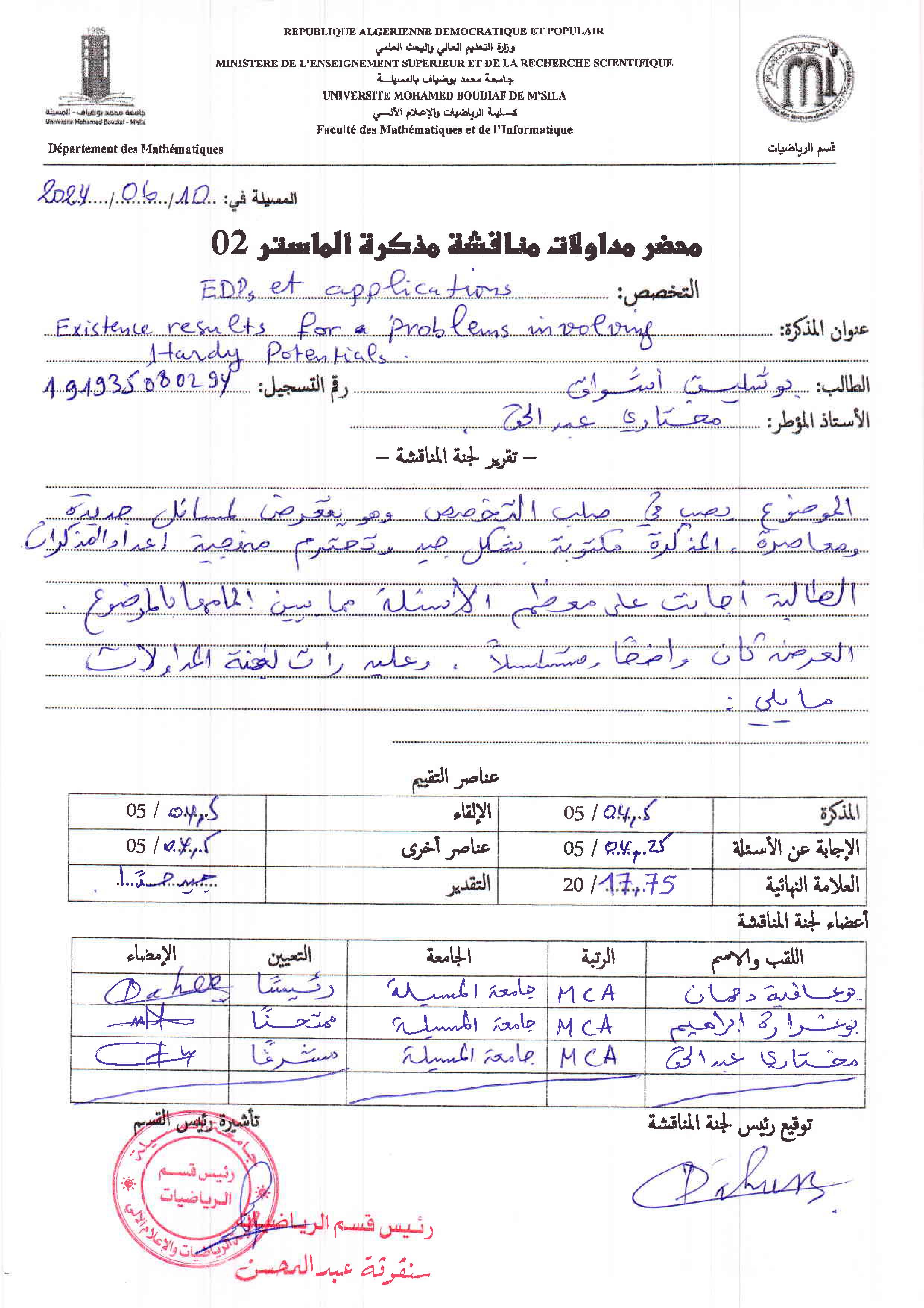 ABDELHAKMokhtari , ,(2016-06-22); Sur l’existence de solutions pour une classe de problèmes aux limites via la théorie des points critiques,Ecole Normale Supérieure - Kouba, Alger,