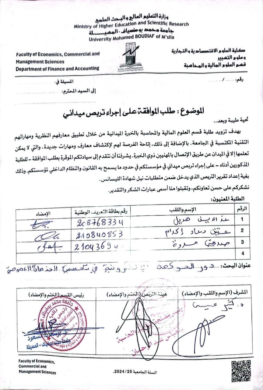 حوكمة الشركات ودورها في تعزيز الرقابة الداخلية دراسةحالة المركب الصناعي التجاري الحضنة المسيلة