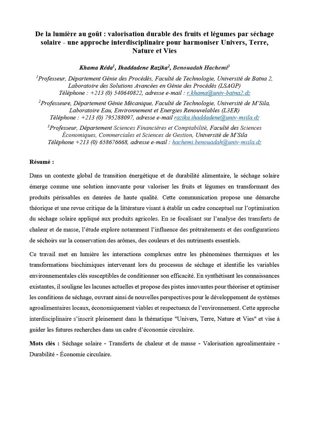 hachemi benouadah , ,(2025-03-05), de la lumiere au gout. valorisation durable,hachemi benouadah,unv telemcen